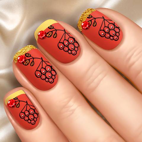 Даже такой развеселый маникюр можно адаптировать под грустную красоту осени. Мягкие переходы между осенними оттенками бордового, темно-оранжевого, шоколадного создадут тёплый и модный образ.
